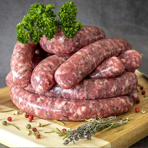 Le grand classique, sans compromis. Préparée avec de l’épaule de porc de premier choix, assaisonnée juste de sel et de poivre, et embossée en boyau naturel. Une saucisse franche, juteuse et digeste, qui plaît autant aux enfants qu’aux puristes du barbecue.